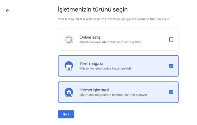 Verdiğiniz hizmet ya da faaliyet gösterdiğiniz alanla odaklı olacak şekilde birkaç anahtar kelime geçirebilirsiniz. Sonrasında kısa bir adım olan işletme türü seçimi ile bilgilerinizi girmeye devam edebilirsiniz.